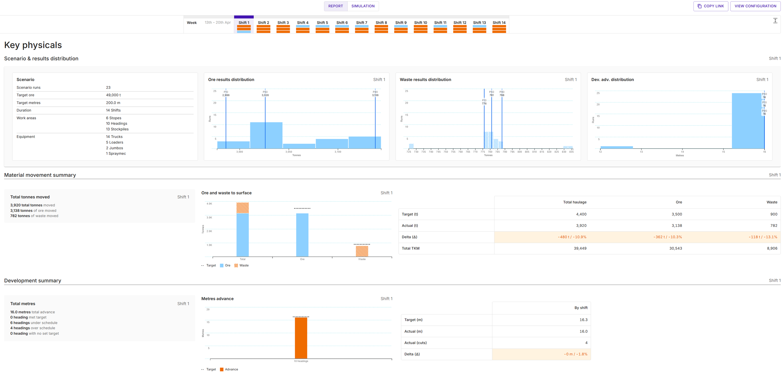 The Key Physicals dashboard in idoba.sim shows the performance of development activities across 14 shifts.