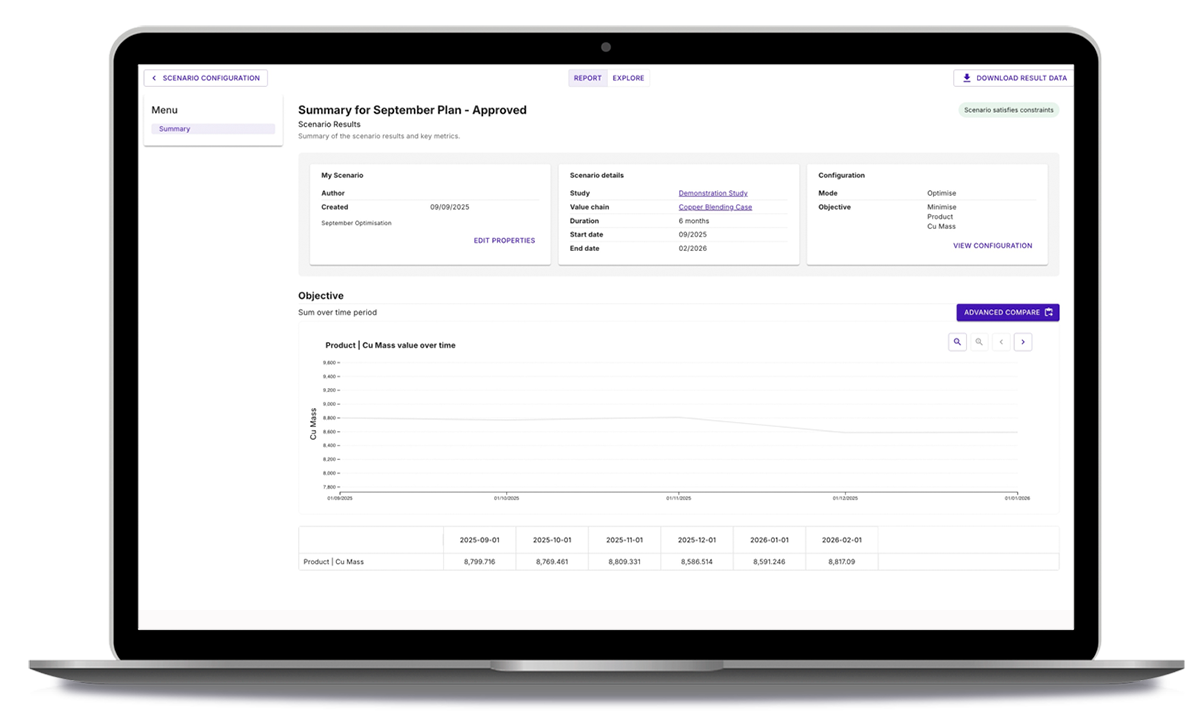 A new summary report is now available that highlights top-level figures for each scenario, with particular emphasis on objective performance for optimisation runs, so you can quickly see how well each scenario meets its targets.